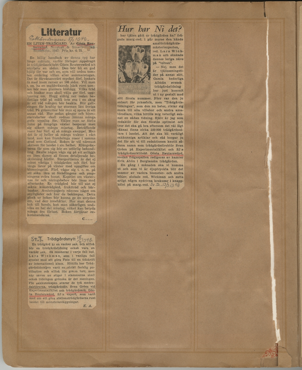 Tidningsklipp ur "Uppsatser om trädgårdar m.m. som på ett eller annat sätt beröra Gösta Reuterswärd. Samlade av Ernst Hj."
