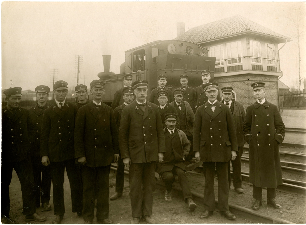 Från vänster:stationskarl T.Holmgren,stationskarl H.Jönsson,stationskarl Windahl, stationskarl A.Lundström, trafikbiträde O.Pettersson och A.Almström,stationskarl S.Åfeldt, stationsförman N.Sjöholm, trafikbiträde C.Månsson, stationskarl Hj.Olsson, stationsförman A.Ekstrand, stationskarl