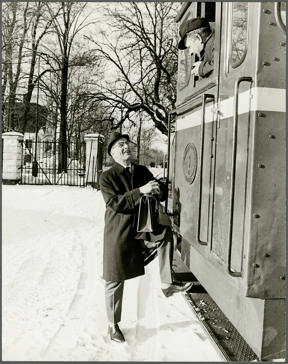 Trafikaktiebolaget GrängesbergOxelösunds Järnvägar, TGOJ Z4 9 på väg in på AB Järnförädlings industriområde. I lokomotorns förarhytt sitter stationsförman Anders Olsson, stående utanför syns bruksdisponent Hans Rudberg.