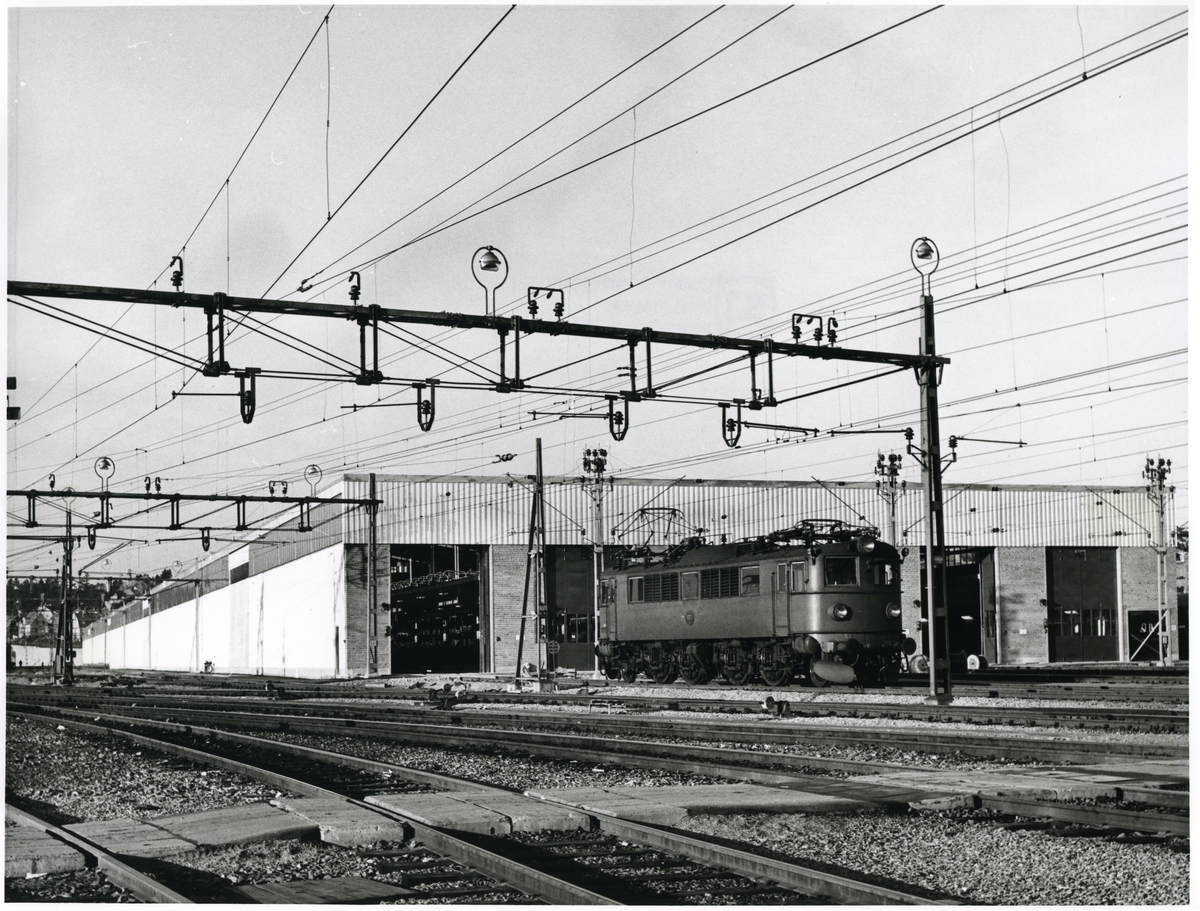 Statens järnvägars SJ F 627 lok som backar in genom portarna i vagnhallens sydöstra gavel för att hämta de färdiga tågsätten, på personbangården i Hagalund.