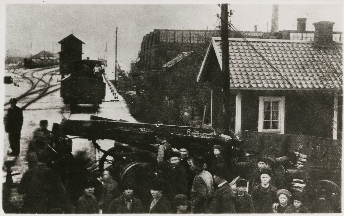 Titel: Folksamling vid bangård efter tågolycka.