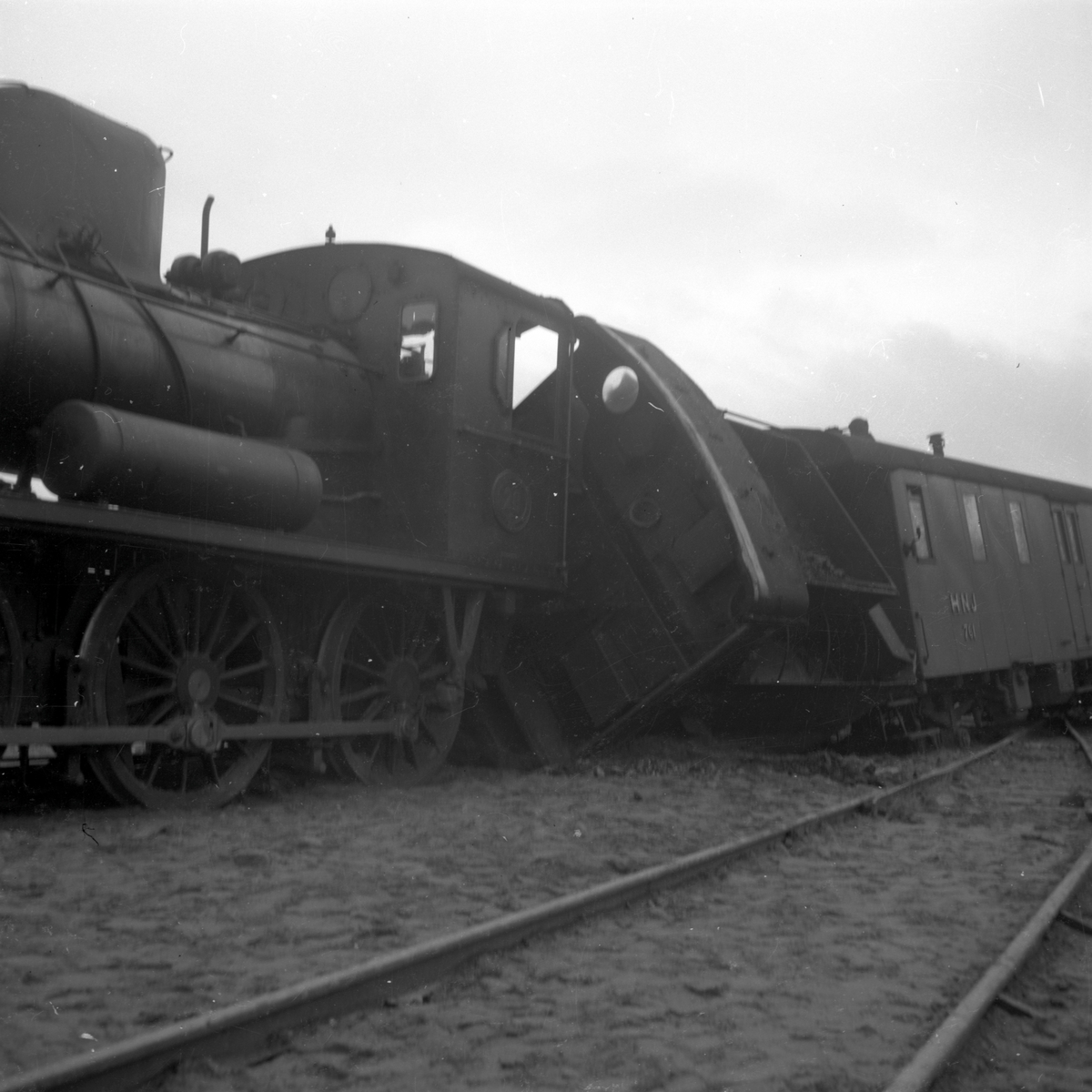 Titel: Tårurspårning vid Bredaryd. Här syns ånglok HNJ lok 28, den urspårade tendern och resgodsvagn HNJ F3 761. Tåget var på väg till Halmstad. Det tillhörde Halmstad-Nässjö Järnvägar, HNJ, och drogs av ångloket HNJ 28 och bestod av fyra vagnar. En resgodsvagn, HNJ F3 761, en postvagn HNJ 19 och två personvagnar däribland HNJ 1011.