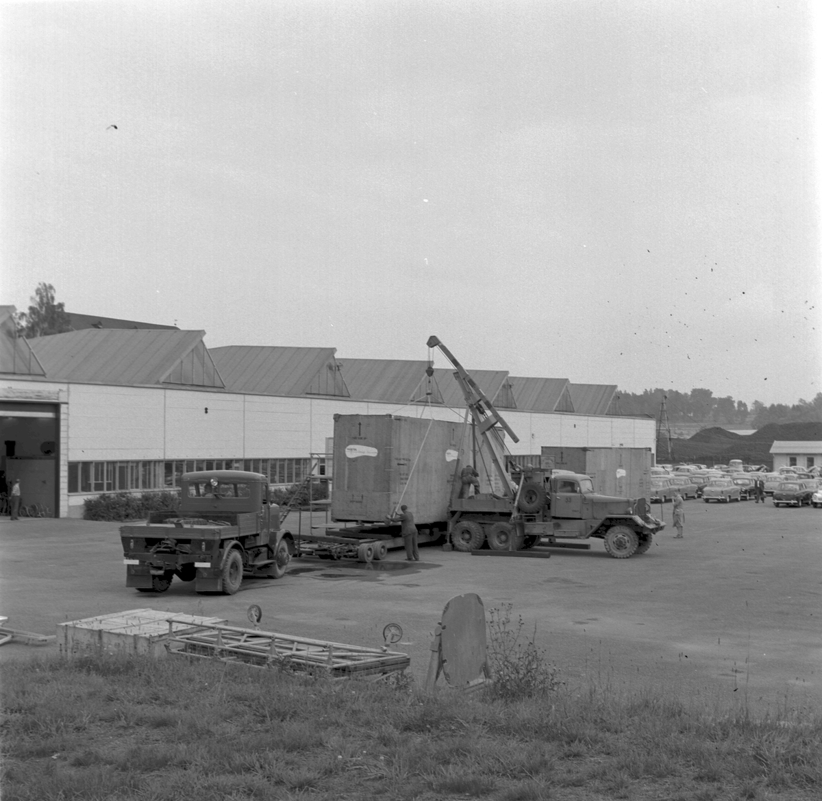 Lossning av helikopter i emballage från låglastande släpvagn, vagnbjörn