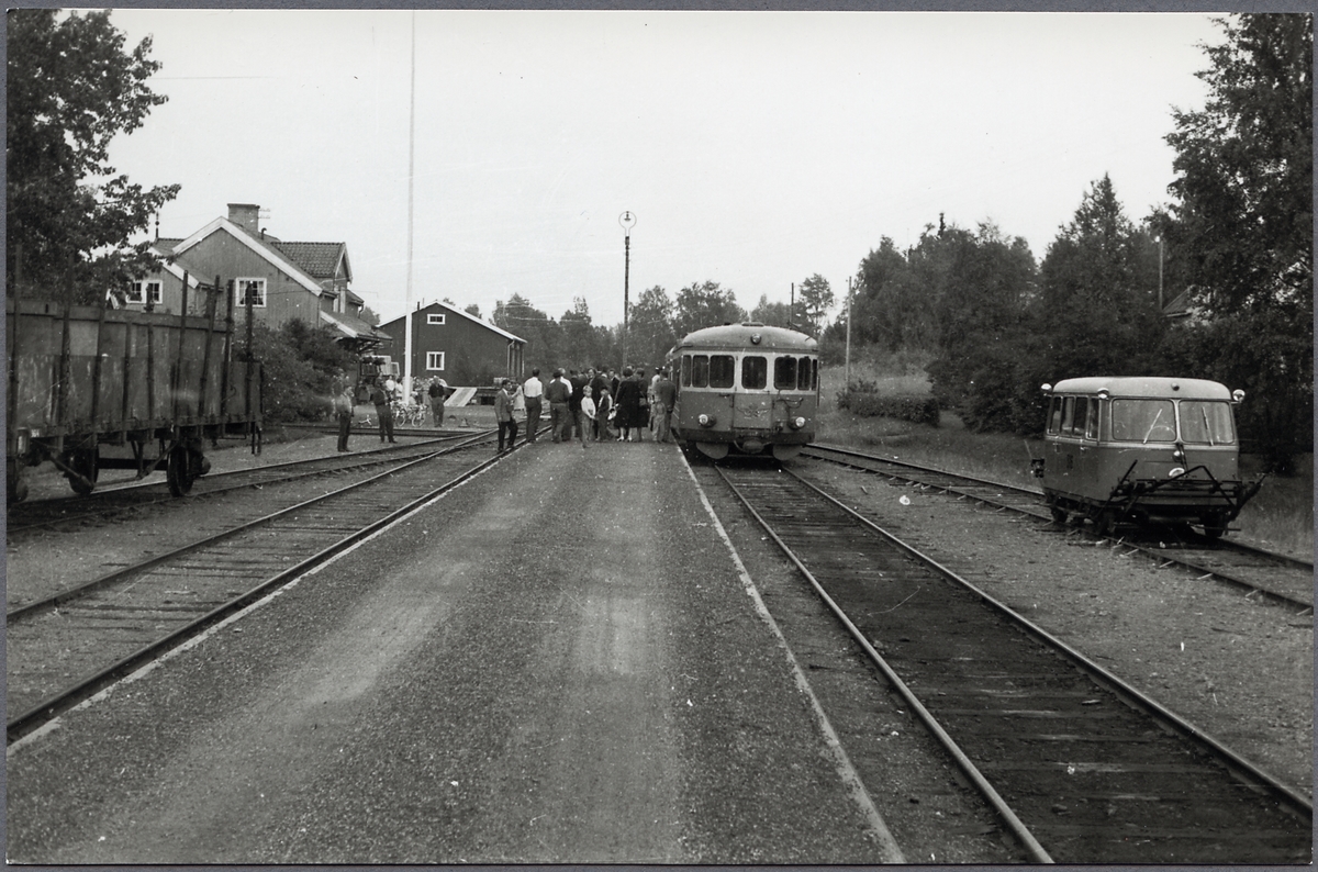 Titel: Resande på en bangård på linjen mellan Mora och Älvdalen. Statens Järnvägar YBo6 1067.