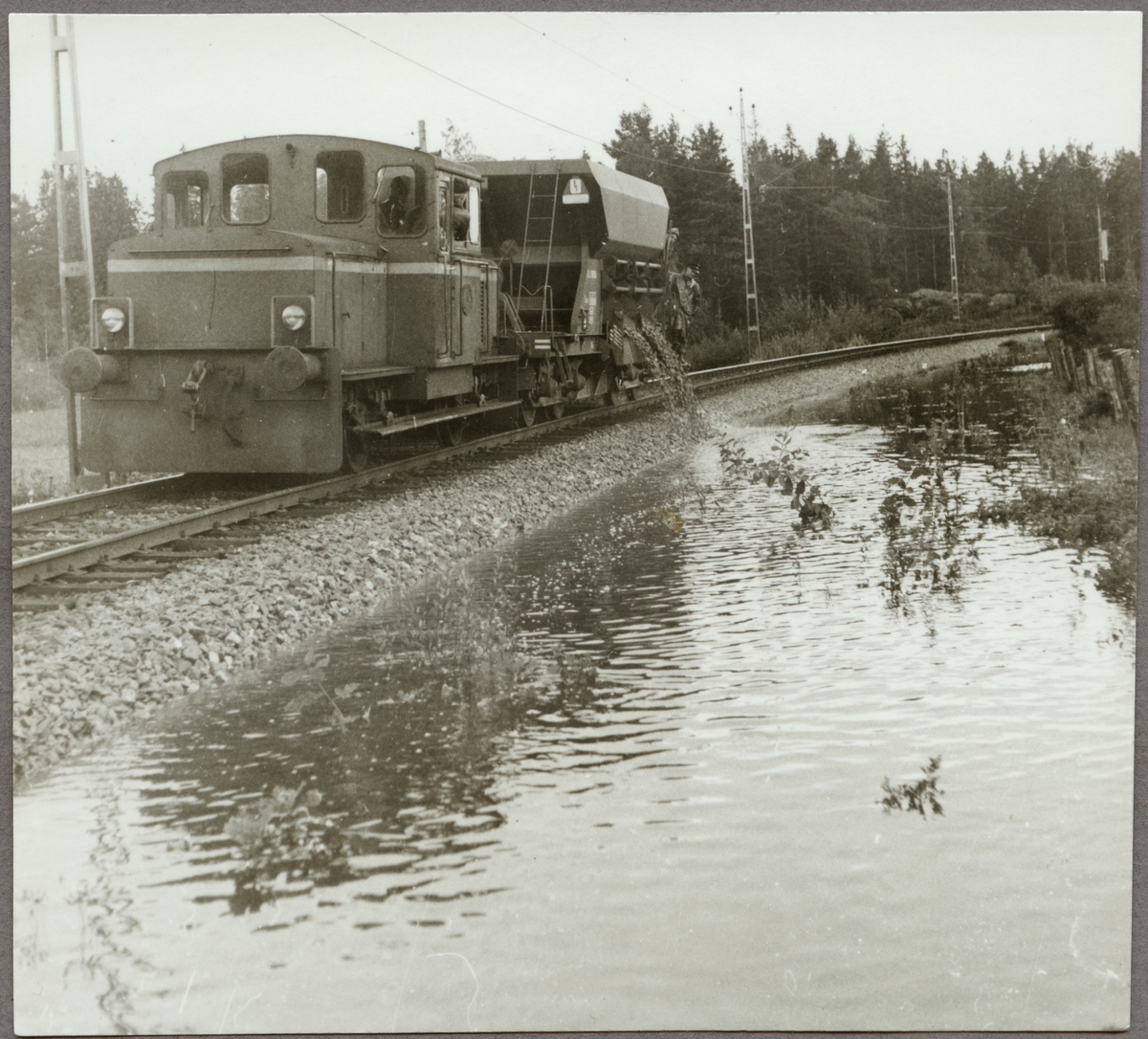 Titel: Påfyllning av makadamm utmed banan mellan Nyköping och Oxelösund 1960.