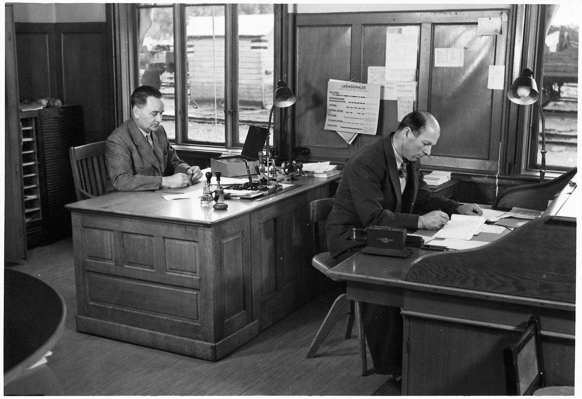 Köping-Uttersbergs-Riddarhyttans järnväg, KURJ. Till vänster på bilden Kontrollör, Ernst Juhlin och till höger på bilden Förste Kontorist, Gustaf Ramström.