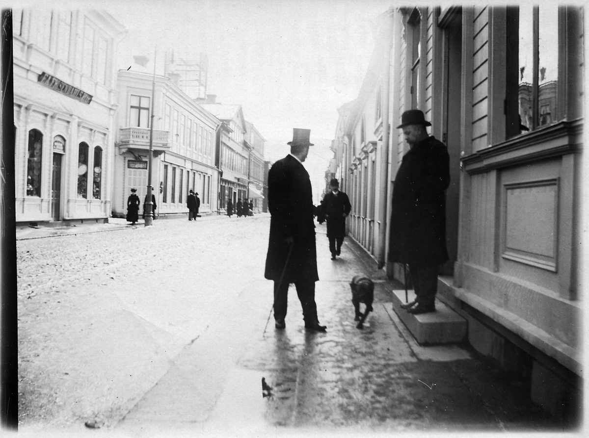 Titel: Järnvägstjänstemän på en affärsgata i Östersund.