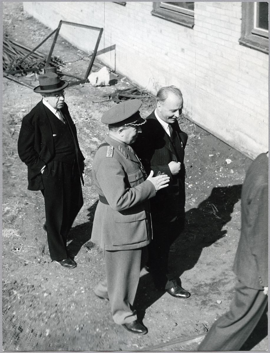 Landshövding Conrad Jonsson, Överbefälhavare Helge Jung och Generaldirektör Gustaf Dahlbeck på väg in i Salpeterfabriken i Köping.