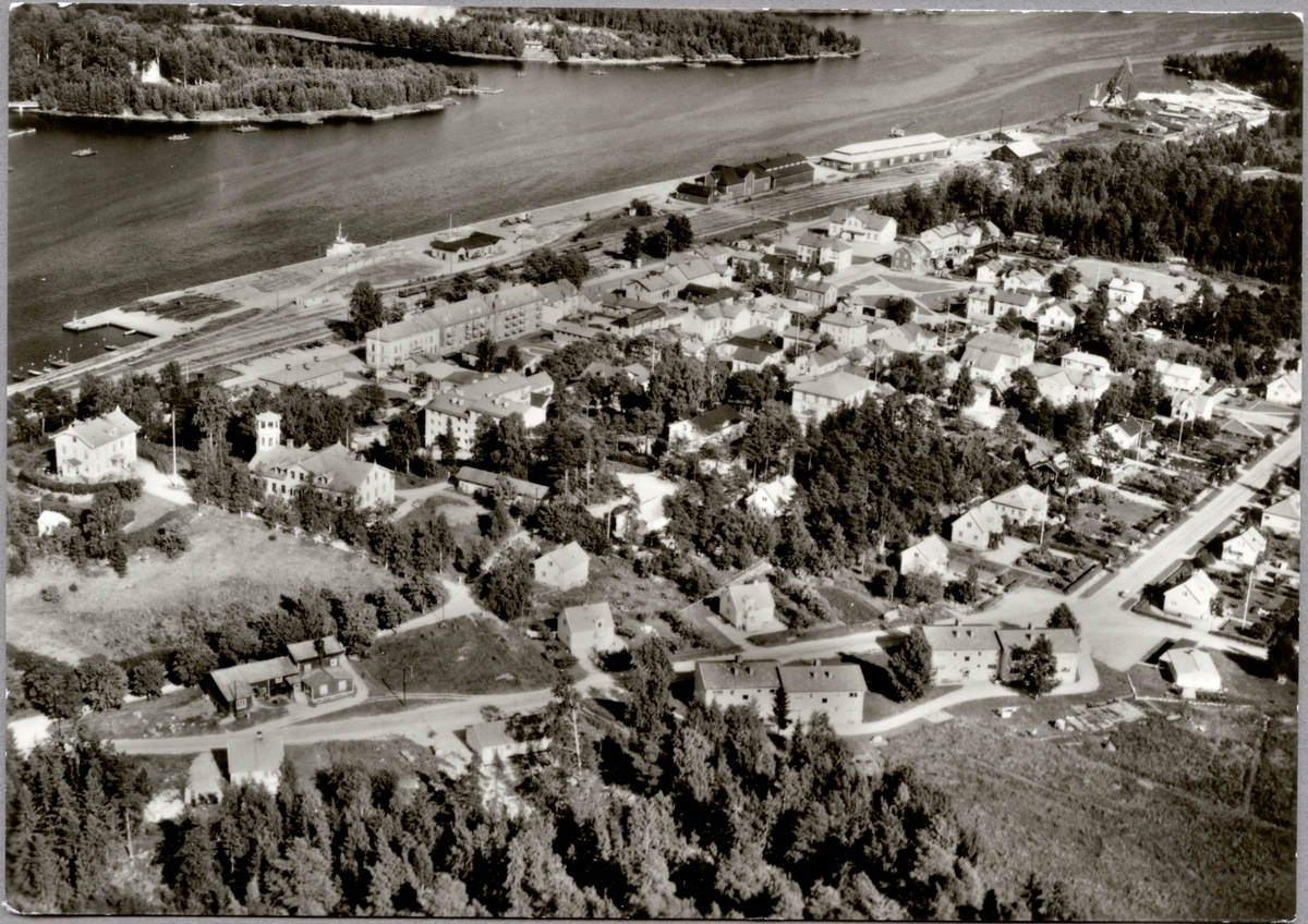Vy över Stugsund med hamnspåren i bakgrunden.