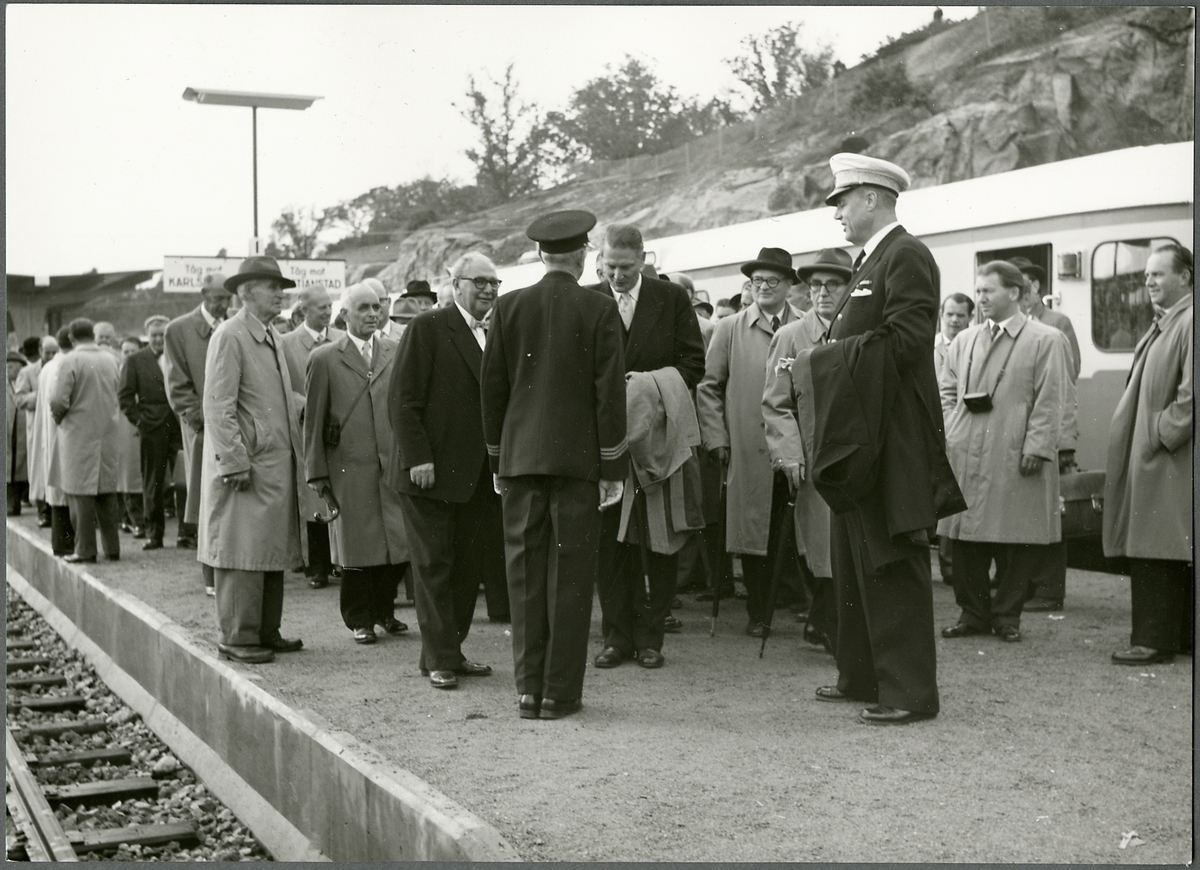 Invigningståget med Landshövding Erik Von Heland och Generaldirektör Erik Upmark med flera vid en station på linjen mellan Kristianstad-Karlshamn.