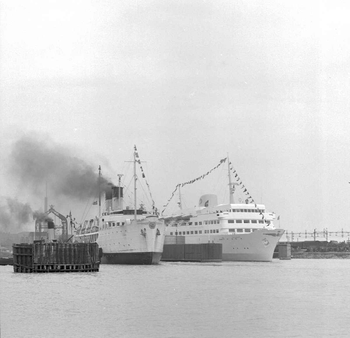 Titel: till höger M/S "Trelleborg" vid färjeläget i Trelleborg. Till vänster "Starke".