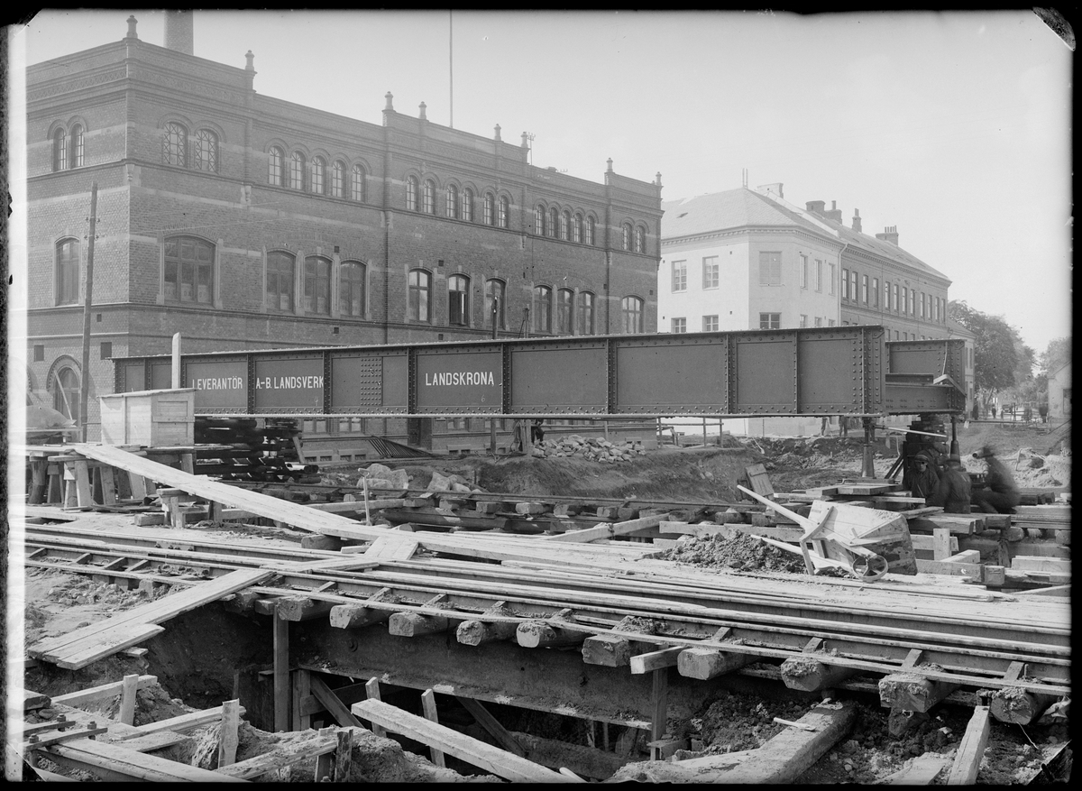 Byggnation av vägport över Trollebergsvägen. Bron på uppspåret lossas.