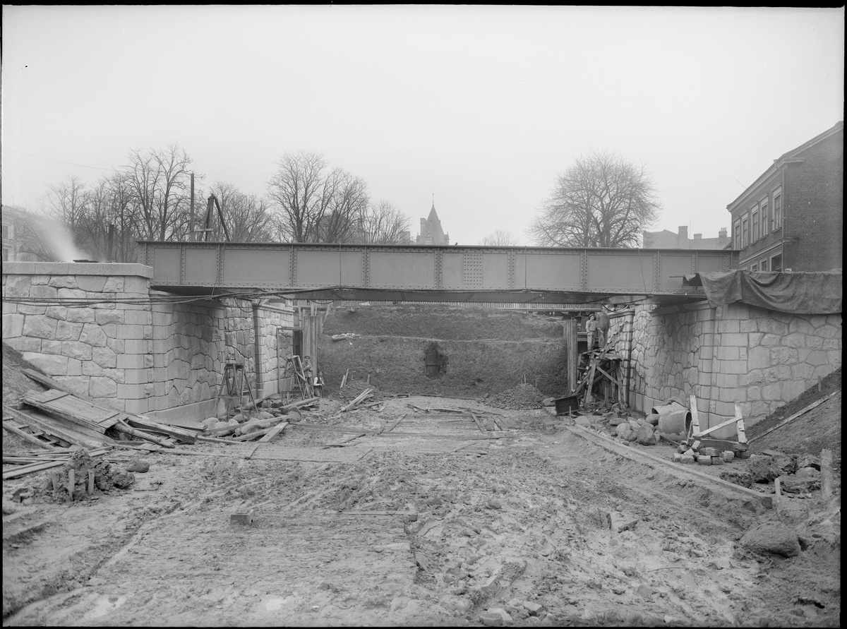 Vid byggnationen av vägporten över Trollebergsvägen i Lund, 1931. Schaktningen under broarna slutförd.
