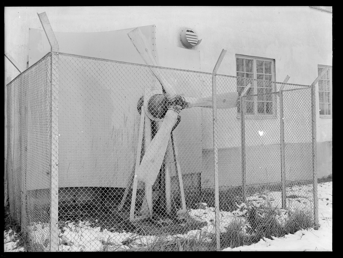 Exteriör vid Stockholm - Roslagens Järnvägar/Stockholms Läns Omnibus verkstad i Enebyberg. Bilden visar luftbromsen, en Alfa Romeo propeller med omställningsmotor.