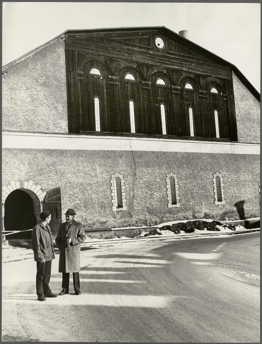 Förman Lennart Pettersson och tjänsteman Karl-Arvid Nilsson framför ett lagerhus vid AB Järnförädling i Hälleforsnäs.