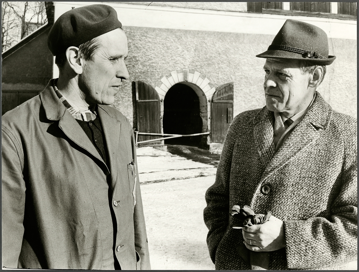 Förman Lennart Pettersson och tjänsteman Karl-Arvid Nilsson framför ett lagerhus vid AB Järnförädling i Hälleforsnäs.
