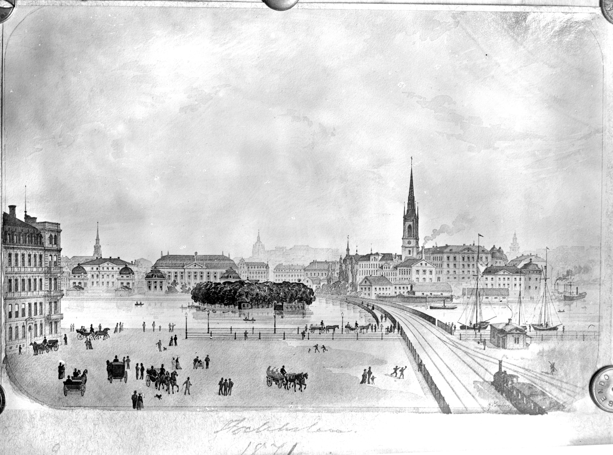 Akvarell år 1872. Sammanbindningsbanan.Riddarholmsbron på sträckan mellan Stockholm C/Tegelbacken och Riddarholmen.