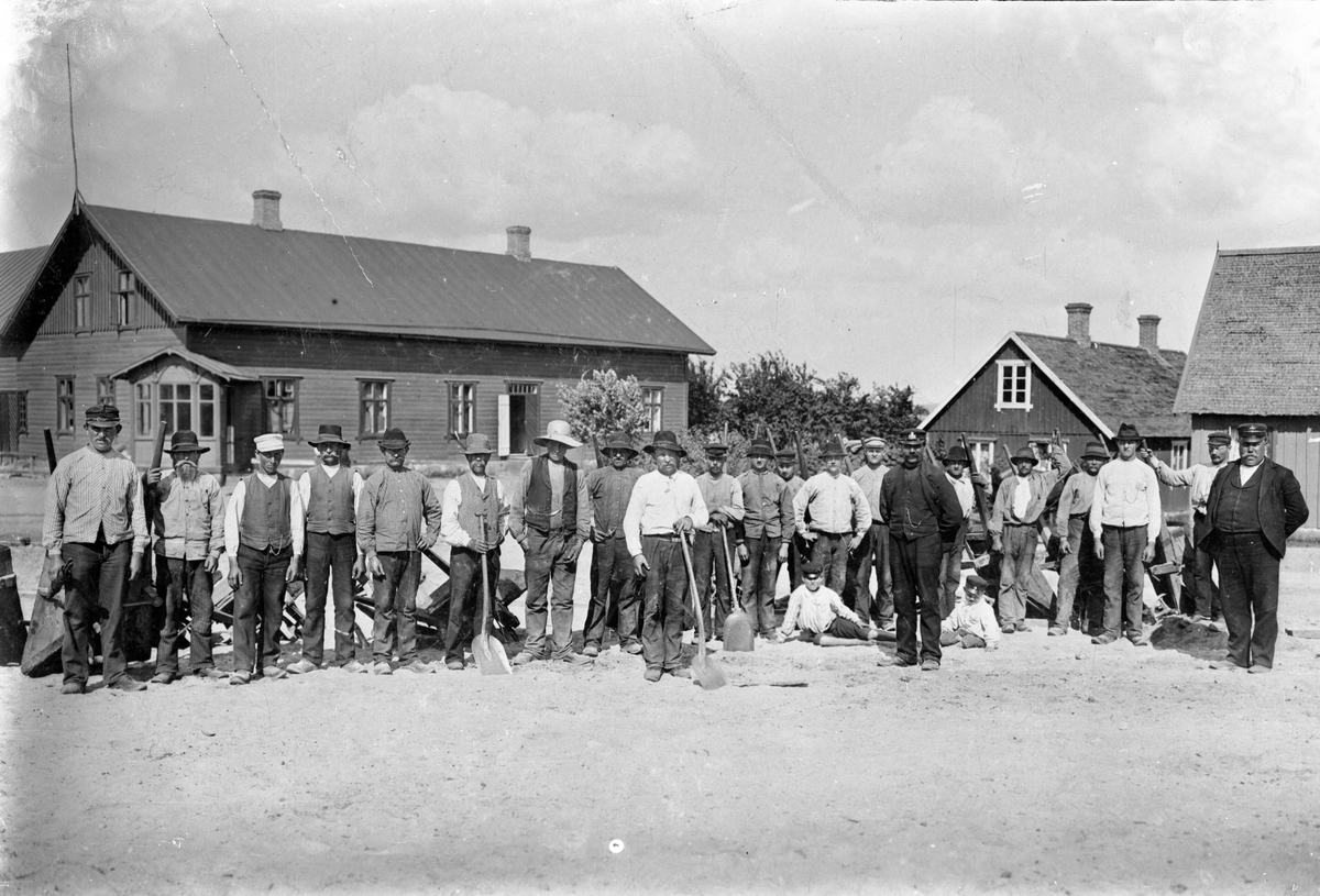 Markarydsbanan. Banvakt A Johansson med rallare. Polis Karlberg från Halmstad placerades i Veinge under tiden för arbetet