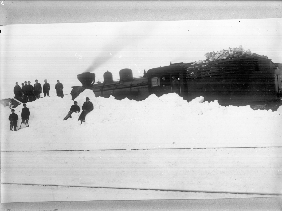 Snöröjning. Statens Järnvägar, SJ vedeldat E-lok på stationen efter ett kraftigt snöfall.