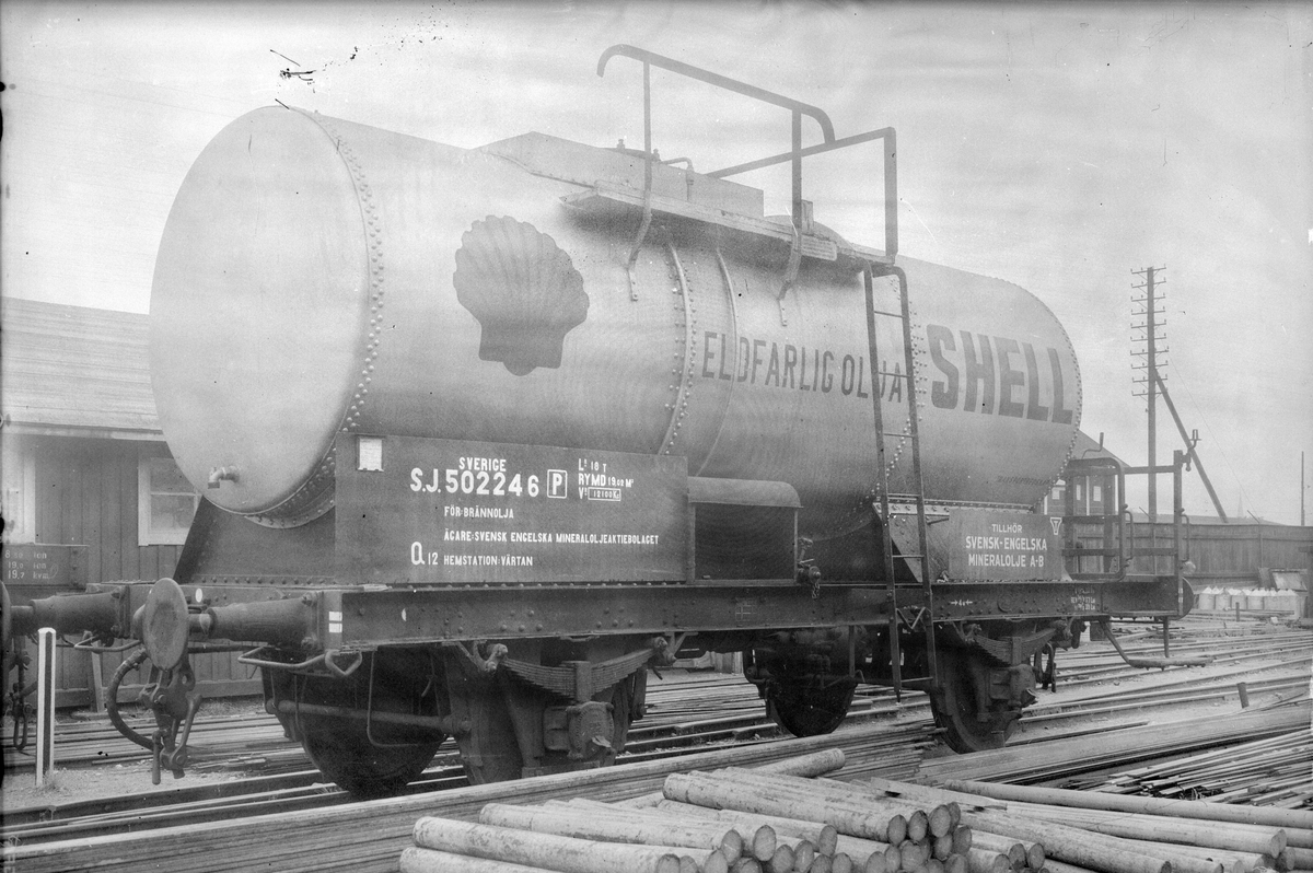 Privatvagn ägd av Svensk-Engelska Mineralolje AB, registrerad hos Statens Järnvägar som SJ Q12 502246. Här på fabriksområdet hos Aktiebolaget Svenska Järnverkstäderna i Linköping.