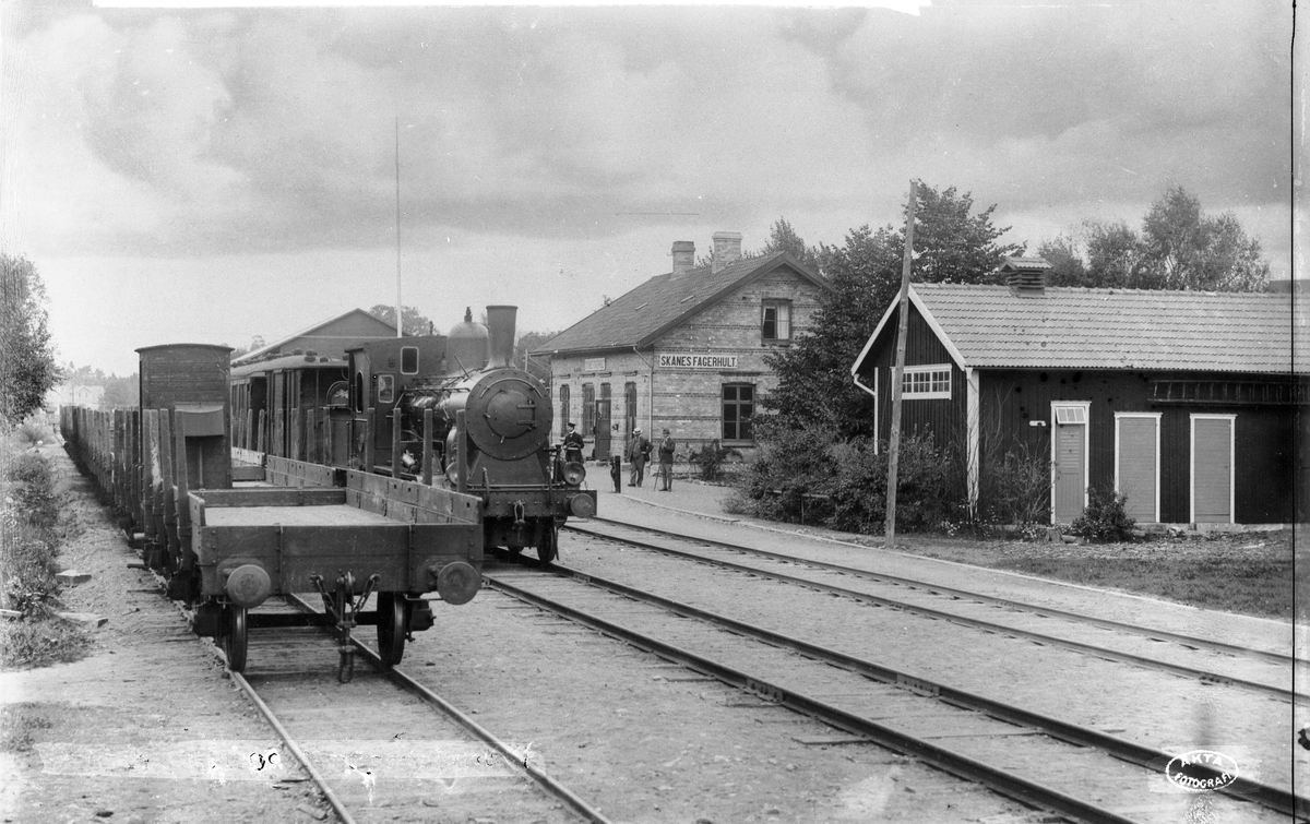 Titel: Skånes Fagerhult station. I främre delen av bilden syns en godsvagn med bromshytt.