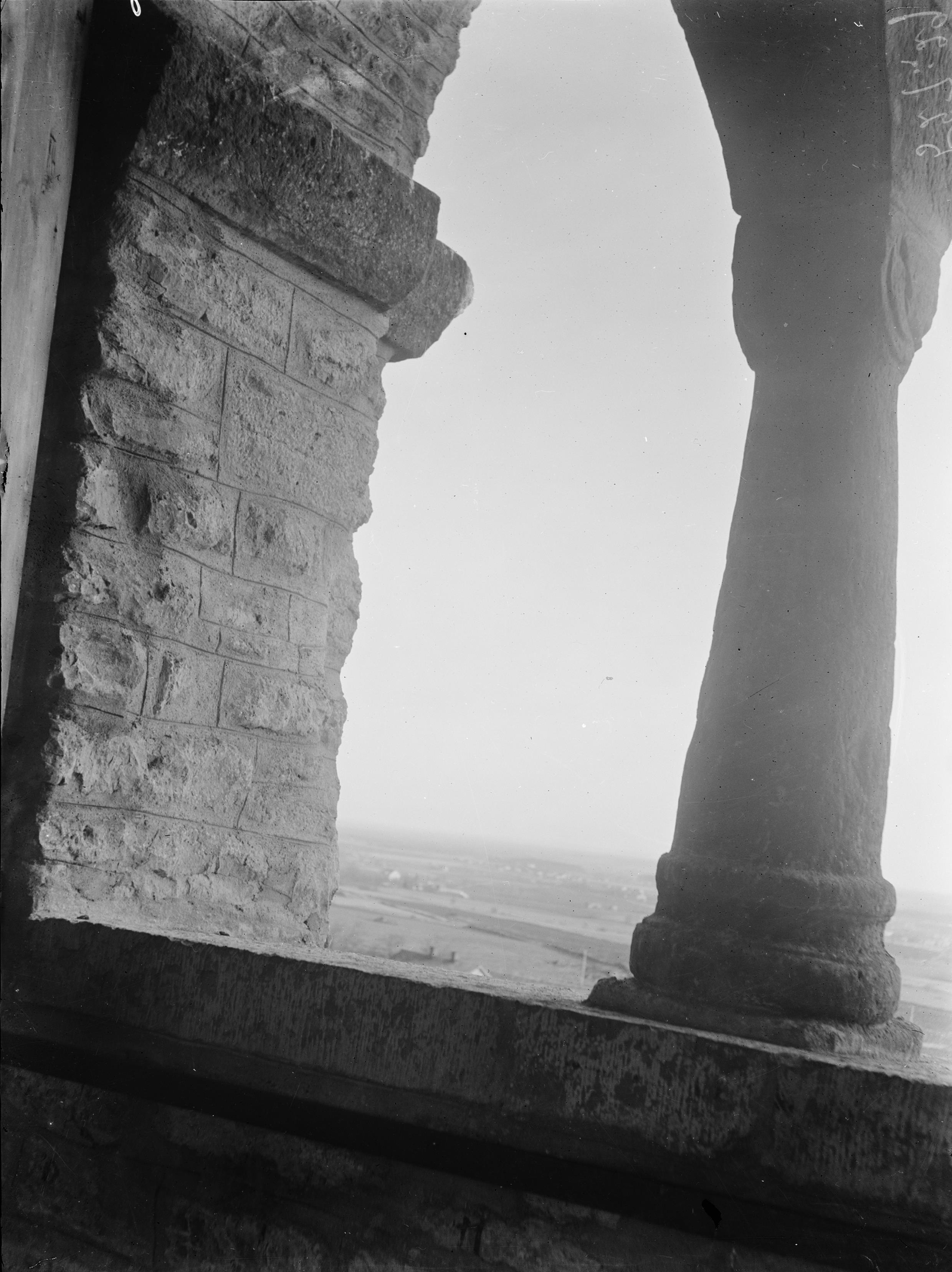 Tornets ljudglugg och kolonn med bas, skaft, kapitäl och entablement.