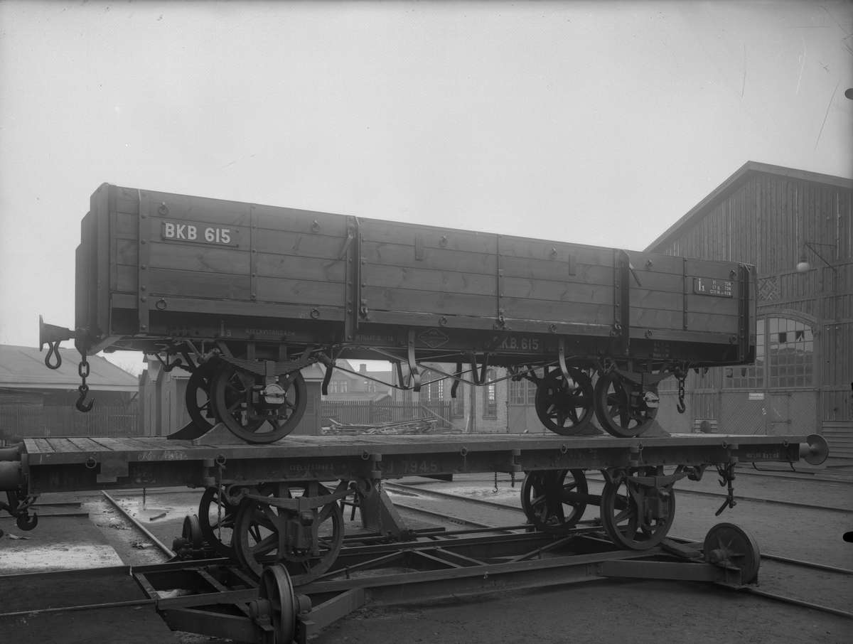 Blekinge Kustbanor, BKB I3 615. Lådvagn lastad på godsvagn Statens Järnvägar, SJ NN1 7945