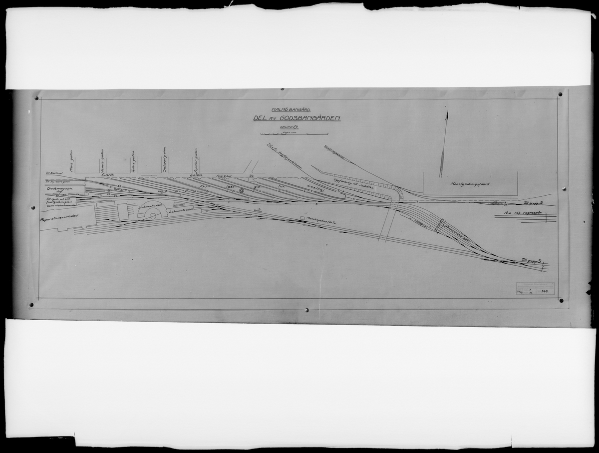 Titel: Bangårdsritning över del av godsbangården vid Malmö centralstation.