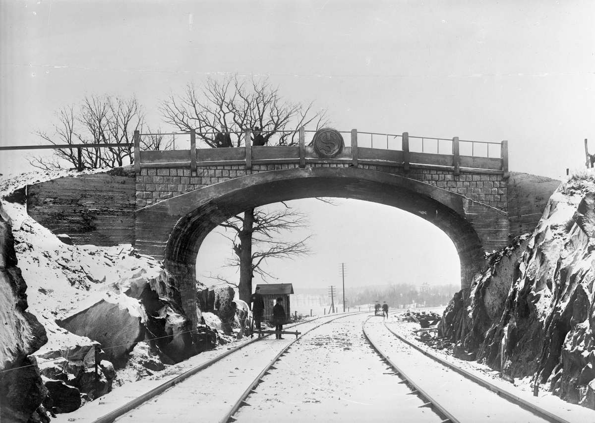 Vägbro över banan vid Brännkyrka (Liseberg). Bron byggd 1909, riven sedan ny bro byggts 1938.