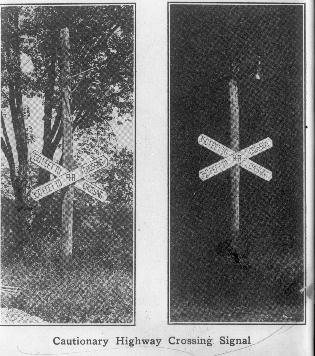 Titel: Amerikanskt kryssmärke som varnar för kommande järnvägskorsning.