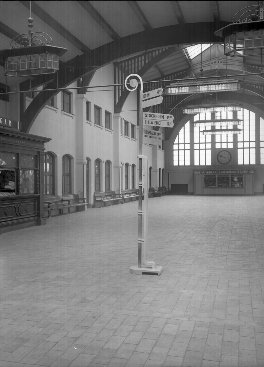 Avgångshallen med kiosk, Göteborg Centralstation. En modell för vägvisare är uppställd