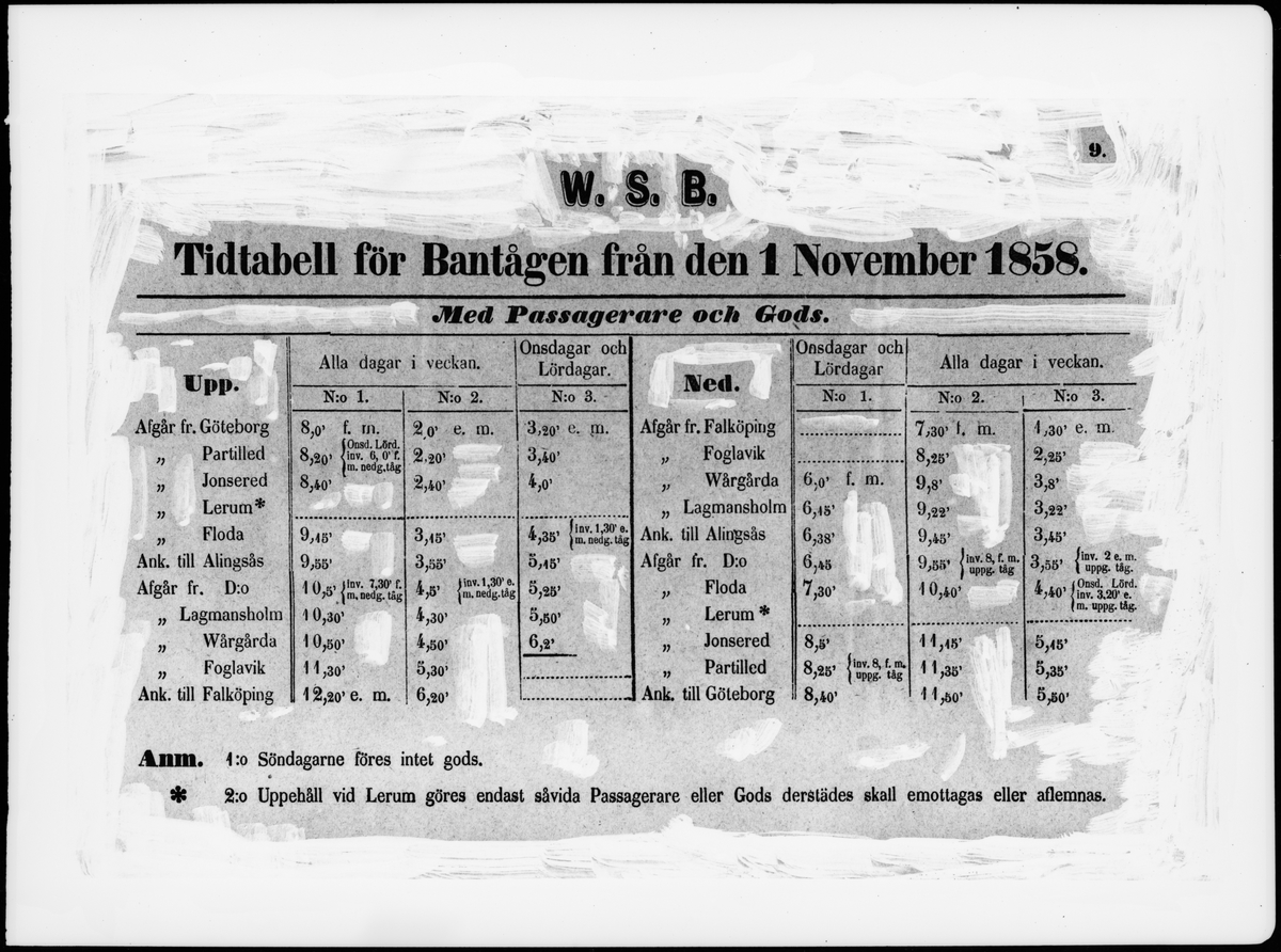 Titel: Tidtabell från 1858-11-01 för Västra Stambanan mellan Göteborg och Falköping.