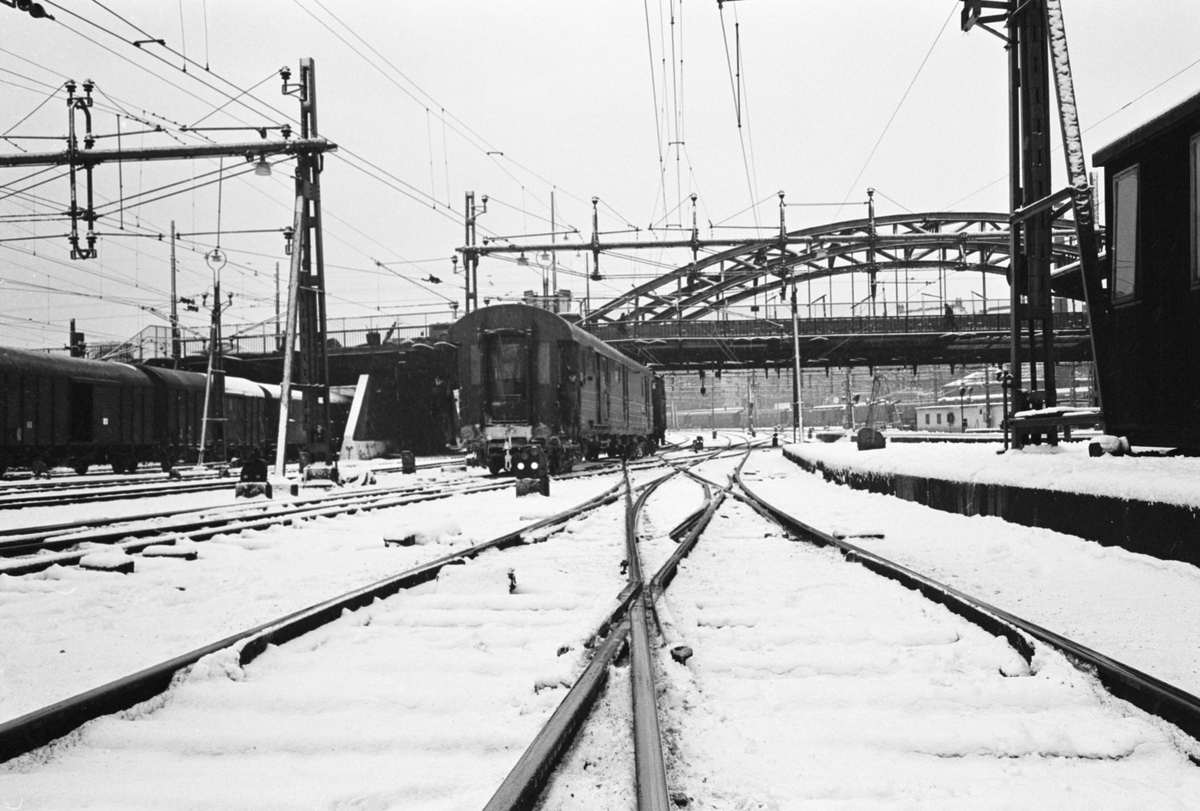 Stockholm Centralstation, vinterbild. Dvärgsignalen visar "Rörelse ej tillåten,stopp". Bron i bakgrunden på bilden är Kungsgatsbron