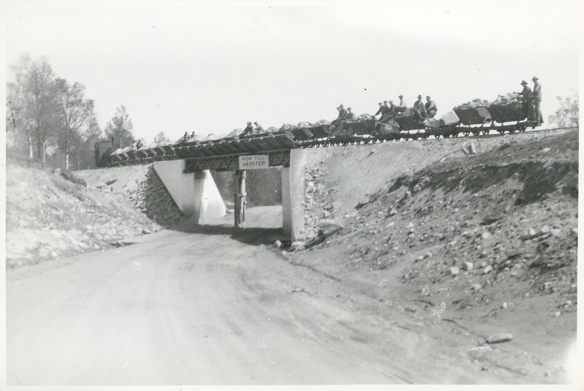 Titel: Banarbetare med gruståg vid Torhult. Vägporten.