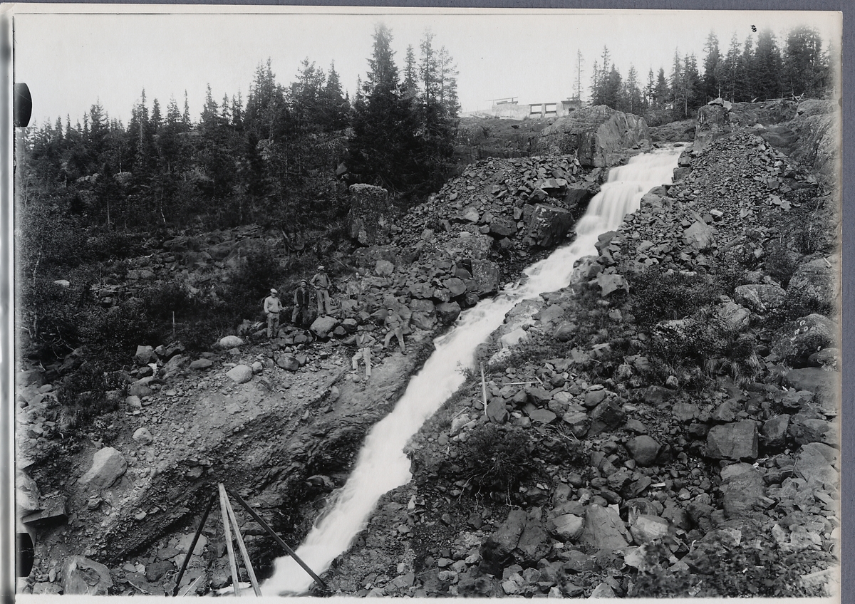 Titel: Damm för vattentagningsanordning byggs vid Transtrand och vatten tas från Östvallen.
