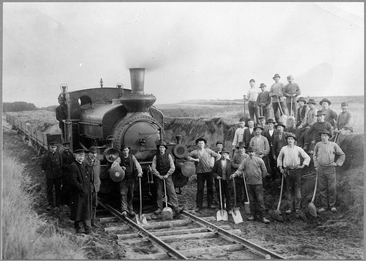 Titel: Gruppfoto vid banbyggnaden av Sölvesborg - Olofström - Älmhults järnväg.