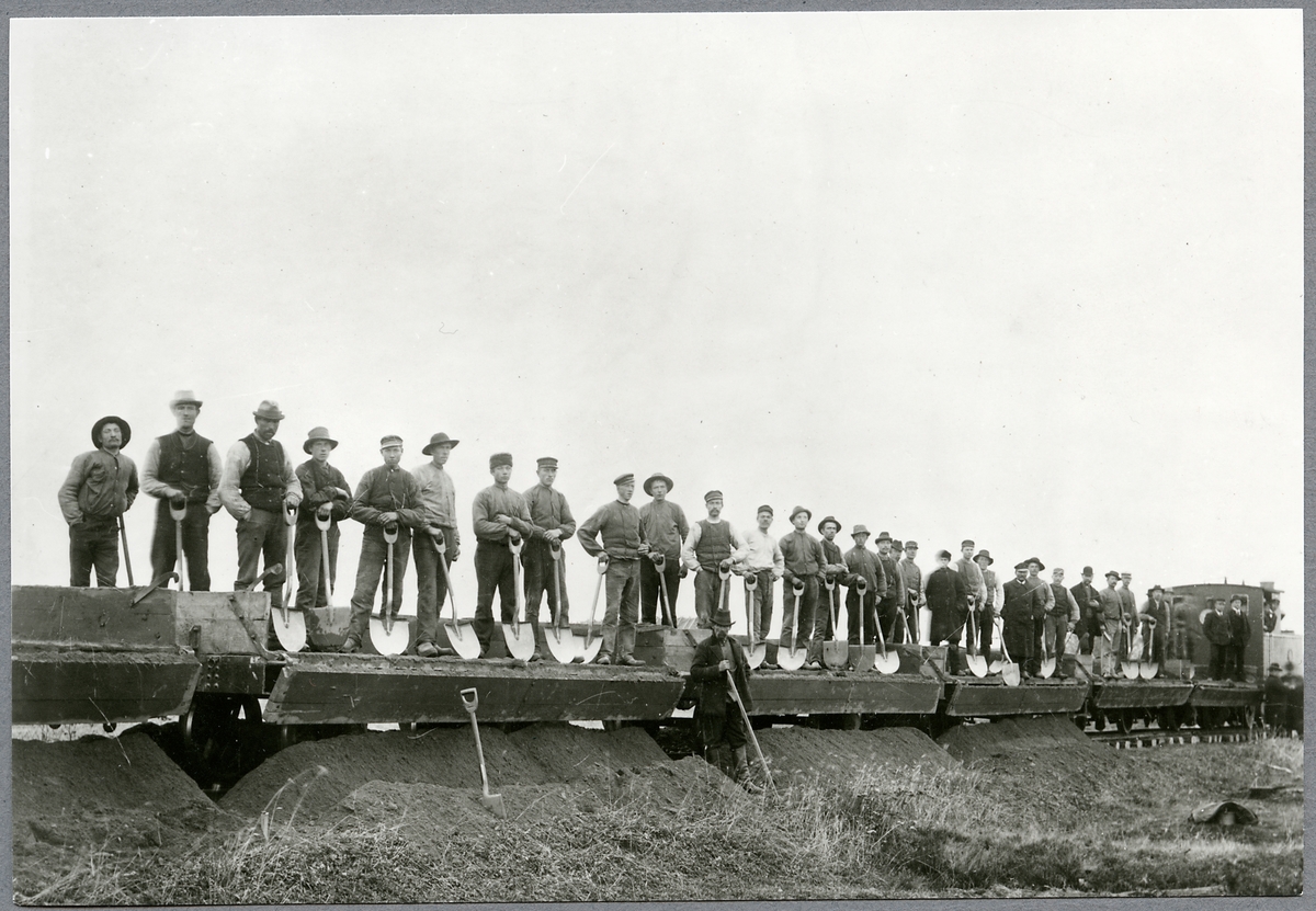 Arbetare utkörda längs spåret vid Essunga tuva vid bygget av Västergötland - Göteborgs järnväg (VGJ) mellan Göteborg och Skara.