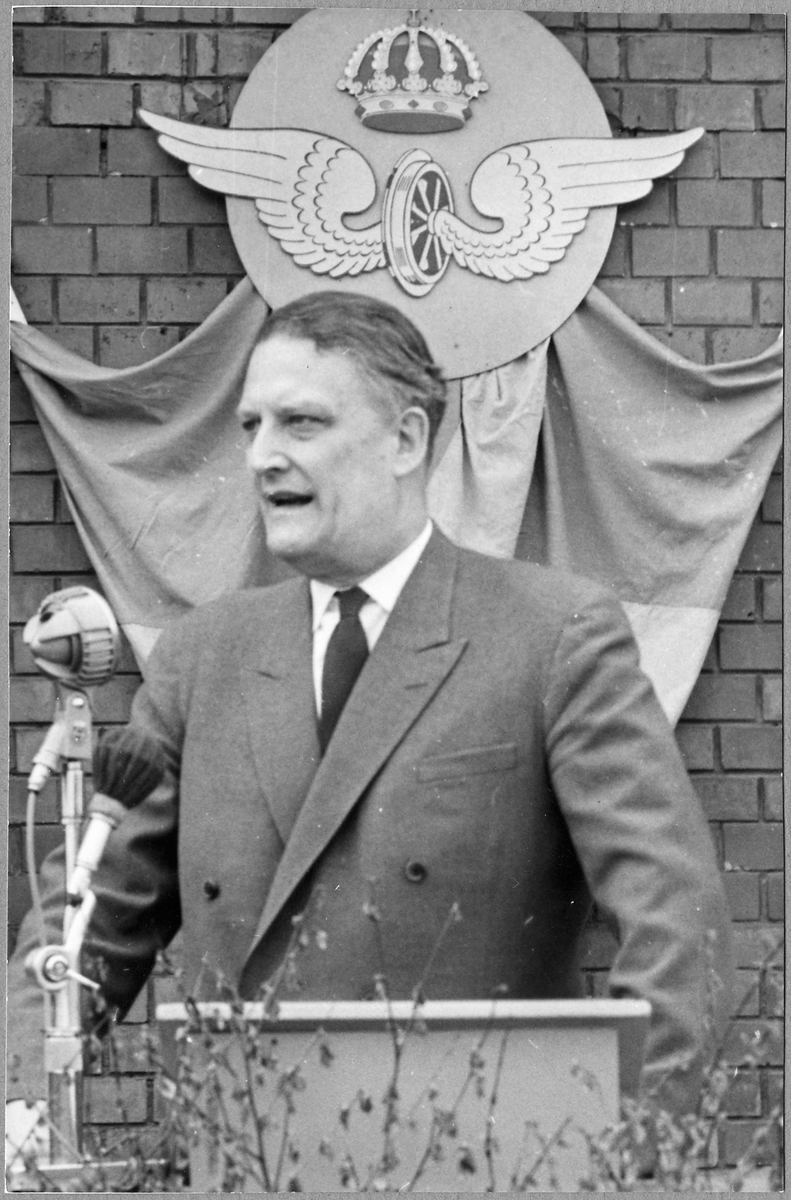 Titel: Generaldirektör Eric Upmark talar vid Borås Central före invigningstågets avgång.