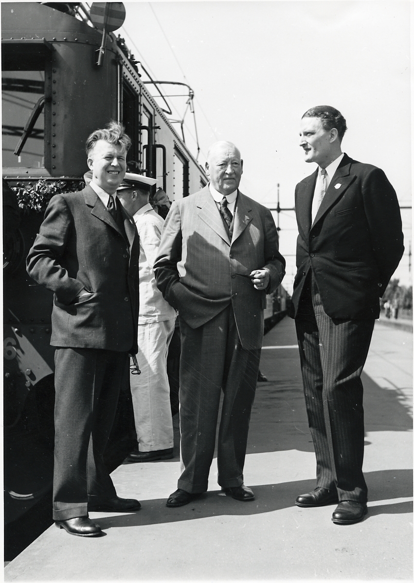 Landshövding Per Nyström, Generaldirektör Axel Granholm och Generaldirektör Erik Upmark på en station någonstans på linjen mellan Borås-Strömstad.