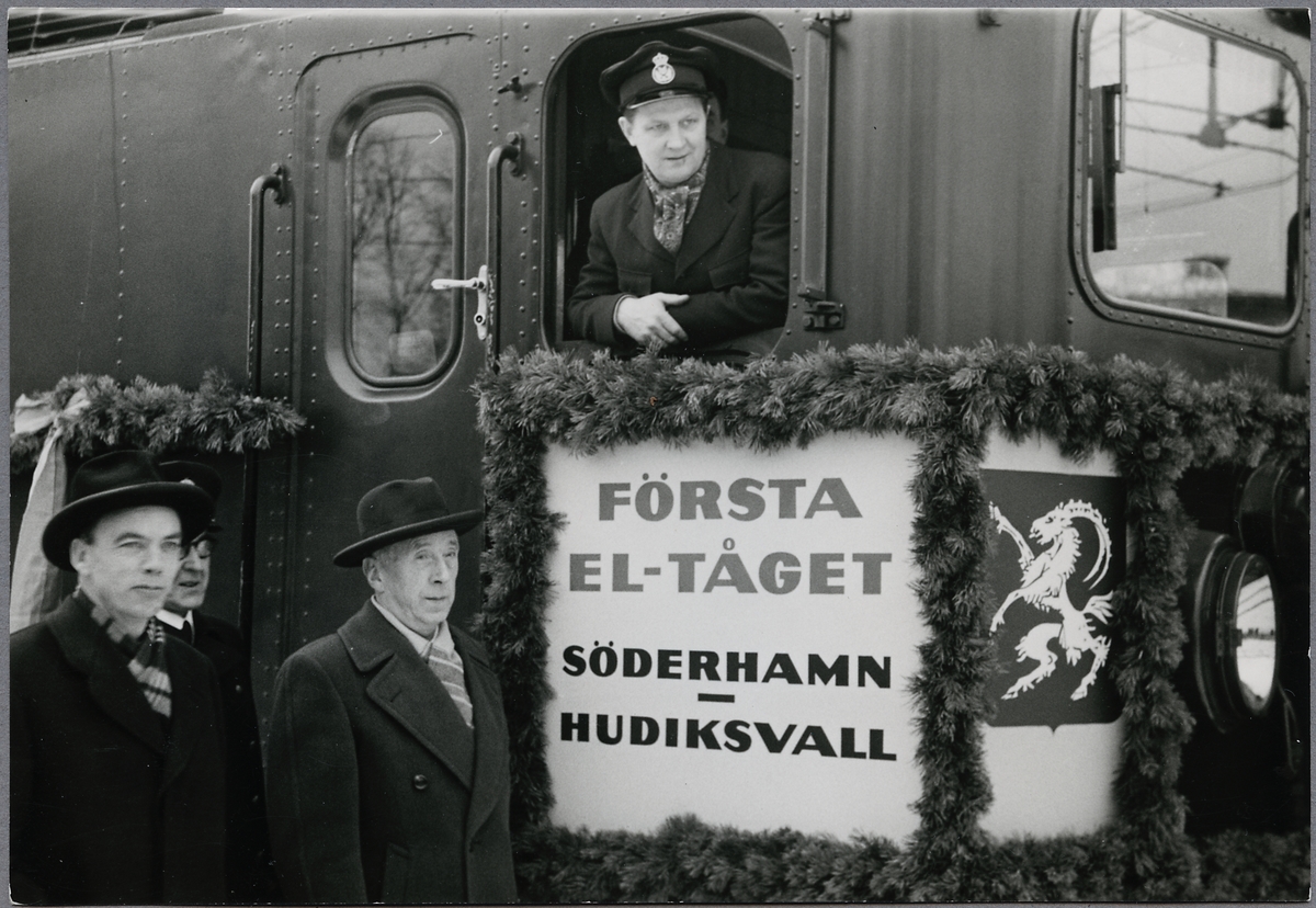 Titel: Lokföraren med flera på loket till Första eltåget på linjen mellan Söderhamn-Hudiksvall.