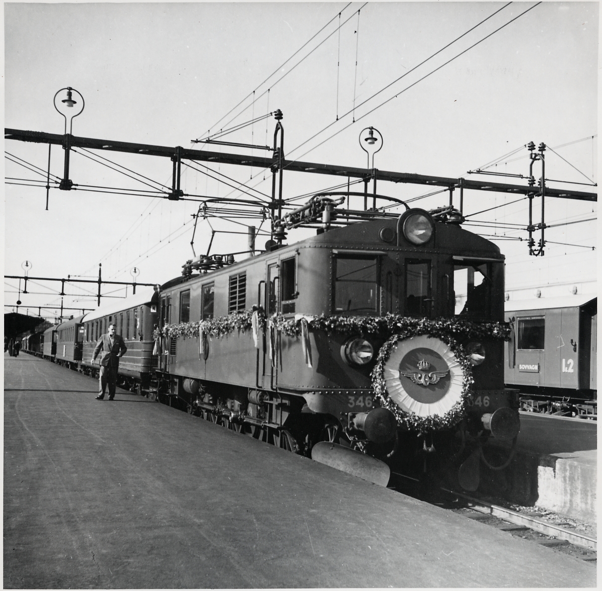 Första eltåget Statens Järnvägar, SJ D 346 vid en station efter linjen.