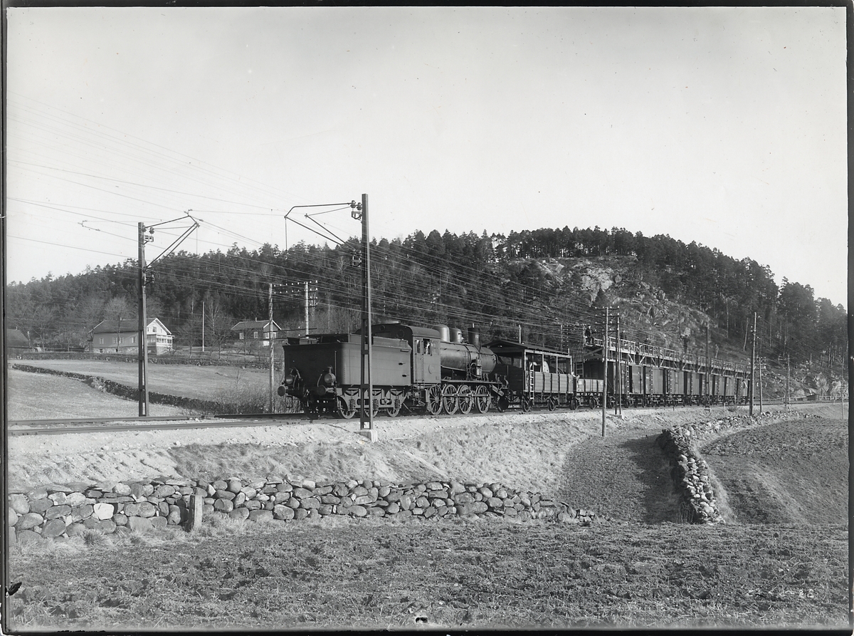 Montagetåg på linjen mellan Stockholm - Göteborg, västra Stambanan. Statens Järnvägar, SJ E 1073.