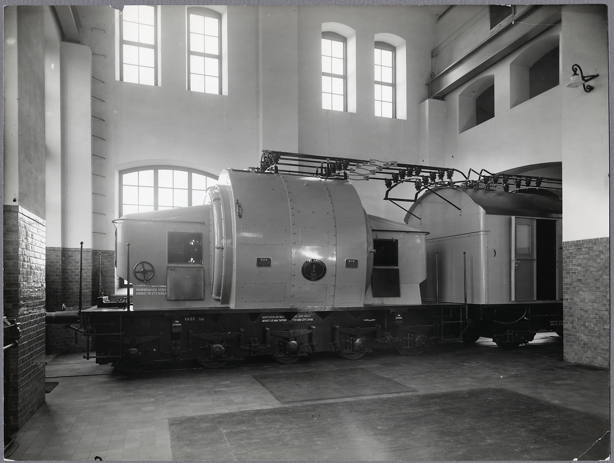 Den nya transportabla omformarvagnen med tillhörande transformatorvagn uppställd för försöksdrift i Sköldinge omformarstation. Statens Järnvägar, SJ Q24 1.