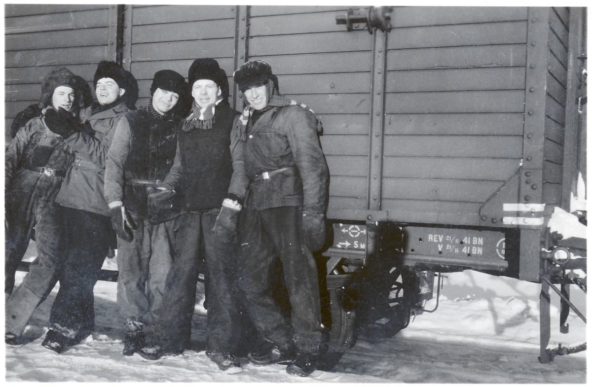 I 40graders kyla måste man vara bra påpälsad, som här i januari 1945 i Täng. Från vänster Olle Söderström, Lindberg, P Ericsson, Helsing, Kjellberg.