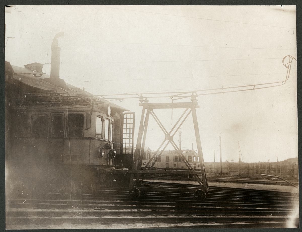 Titel: Strömavtagarvagn "Tekla" kopplat till ellok.