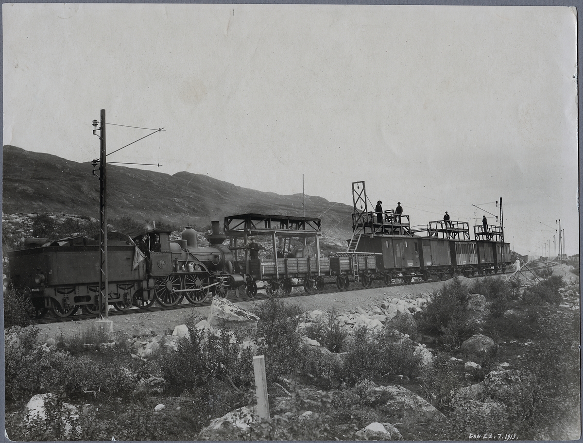 Montagetåget, Statens Järnvägar, SJ Ca 296 "Skagul" med vagnarna SJ VNVR 46, SJ VNVR 43, SJ bangårdsvagn 61 och SJ bangårdsvagn 83, någonstans mellan Kiruna-Riksgränsen.