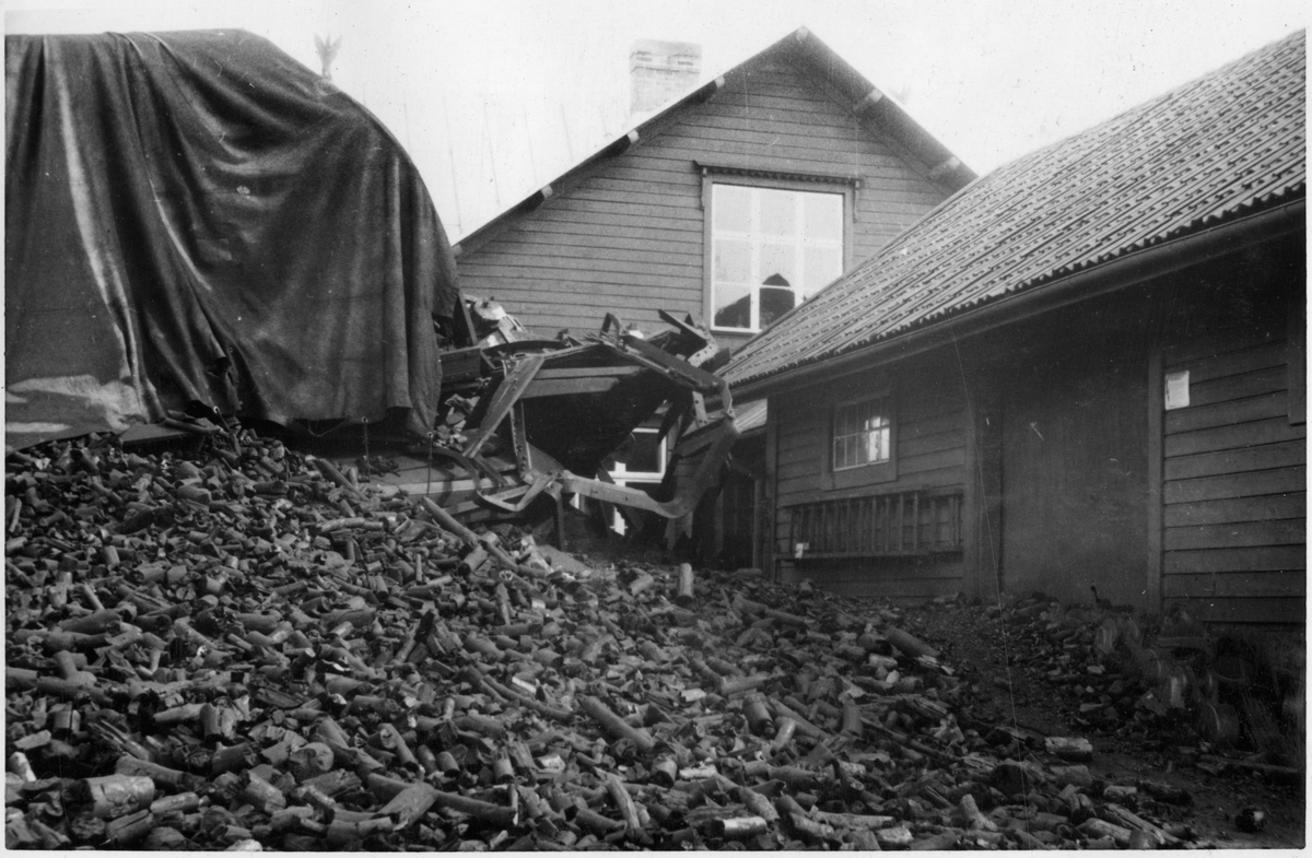Titel: Urspårad godsvagn med spillt tackjärn vid stationshus.