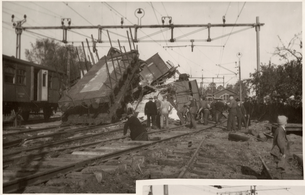 Titel: Arbete och rester av vagnar på bangård efter urspårning.