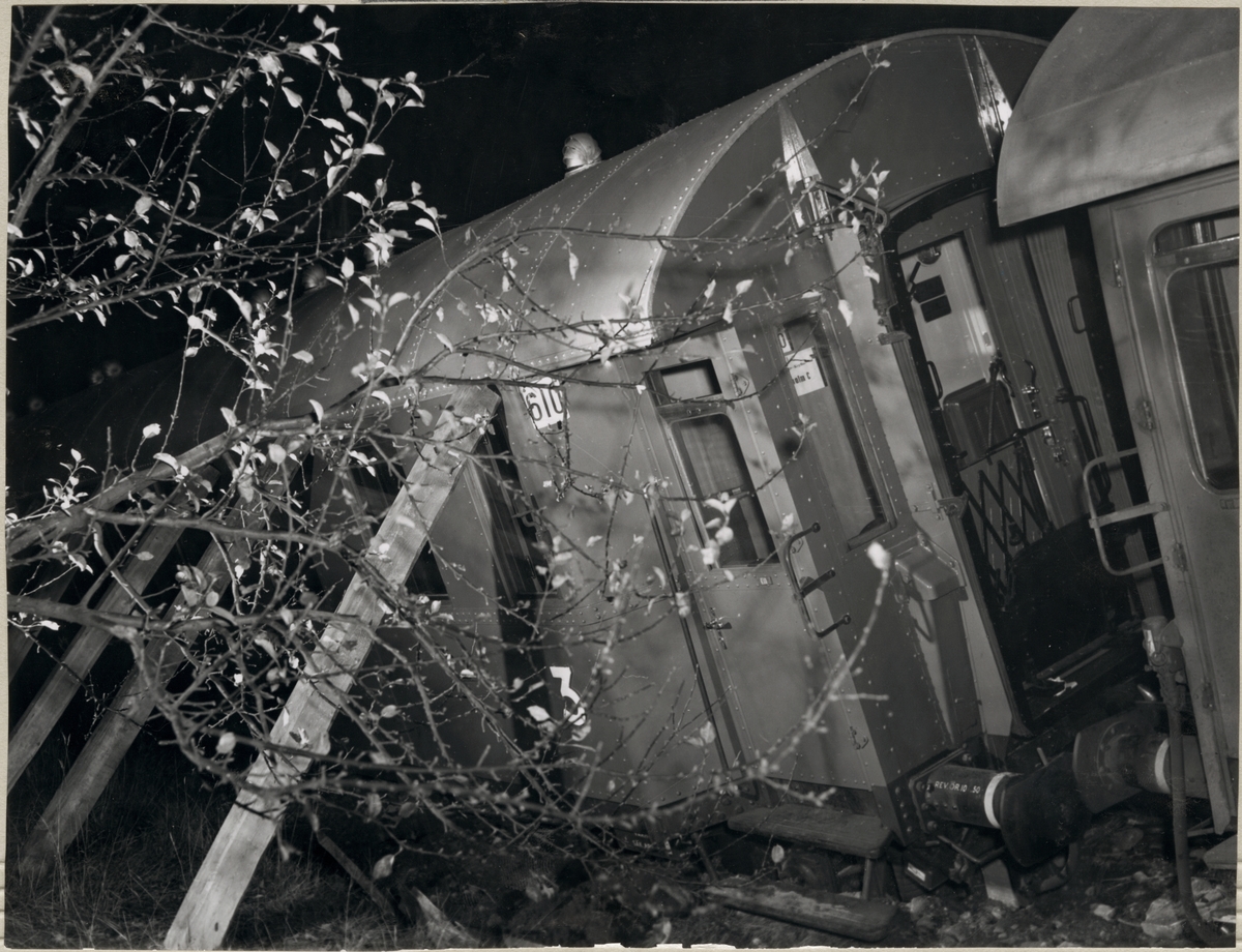 Personvagn med stabiliserande bjälkar efter urspårning mellan Ålbo och Järlåsa.