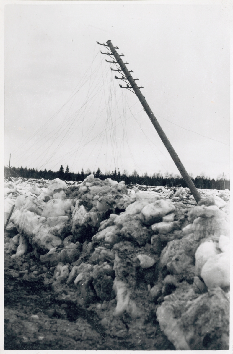 Snö, is och skadad telefonstolpe efter översvämning i Tornedalen.